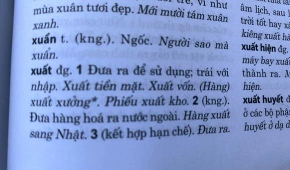 Xuất hàng, xuất kho, xuất khẩu Xuất quân – Dịch nghĩa: ra quân đánh trận Nội bất xuất, ngoại bất nhập – Dịch nghĩa: trong không được ra, ngoài không được vào Xuất khẩu thành thơ – Dịch nghĩa: Lời nó ra đã thành thơ Xuất giá – Dịch nghĩa: Ra lấy chống,…