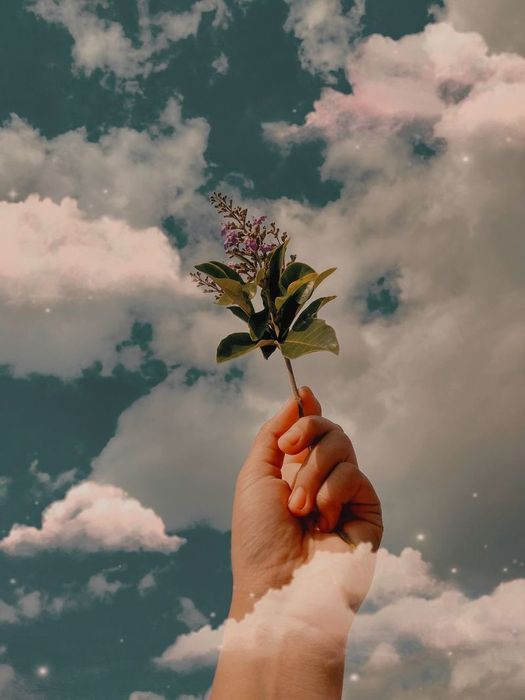 Hình bầu trời có tay cầm hoa, kết hợp tinh tế giữa thiên nhiên và nghệ thuật