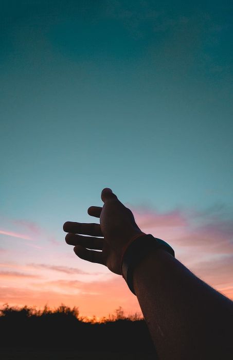 Hình ảnh bầu trời hoàng hôn có tay, ghi lại khoảnh khắc giao thoa giữa ánh sáng và bóng tối