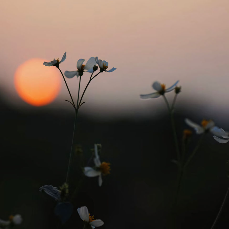 Ảnh hoa buồn ngang mở rộng góc nhìn, cho thấy rõ môi trường xung quanh. Một bông hoa đứng giữa thảo nguyên, nhành hoa rơi giữa vũng nước mưa, tất cả gợi nỗi cô đơn trải dài như không gian. Sự tương phản giữa hoa và nền càng làm nổi bật cảm giác trống vắng, như nỗi buồn loang ra vô tận.