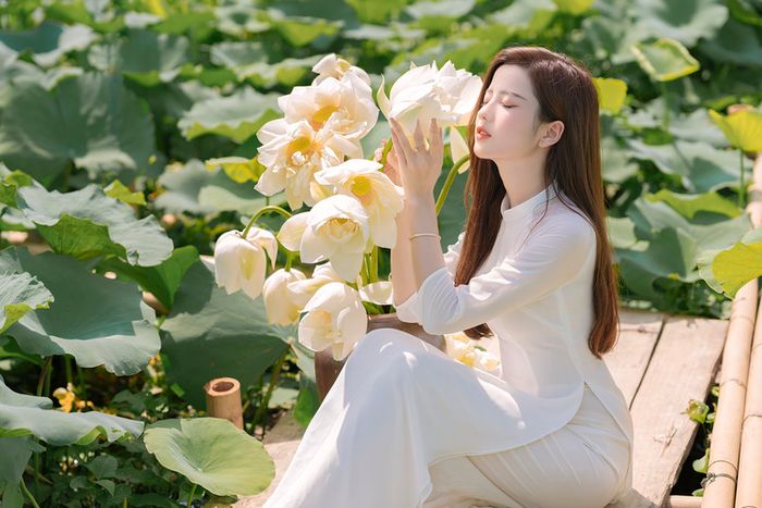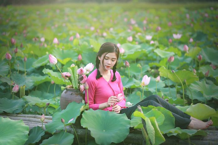 Hình ảnh thiếu nữ Việt Nam duyên dáng giữa đầm sen, hòa quyện giữa người và cảnh