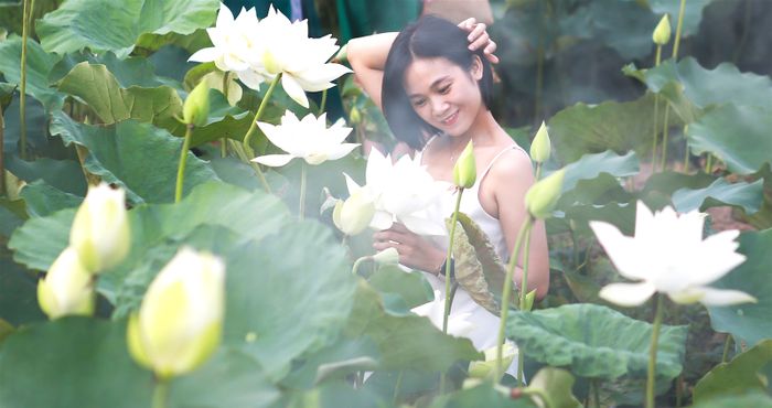 Khoảnh khắc thiếu nữ duyên dáng bên đầm sen