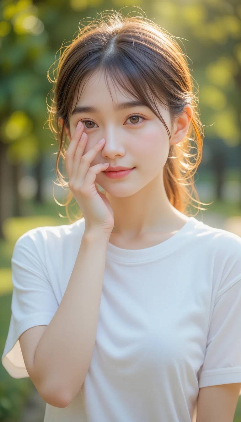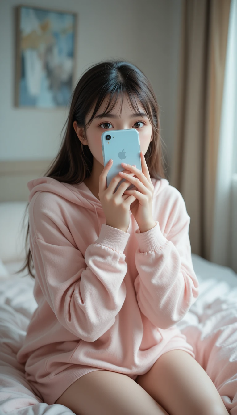 Những bức ảnh với nụ cười nhẹ, tay che miệng hoặc cầm điện thoại che mặt luôn mang lại cảm giác đáng yêu, tinh khôi. Phong cách này thường xuất hiện trong ánh sáng tự nhiên, tone pastel hoặc trắng nhẹ, cực hợp làm avatar Facebook, Instagram, Zalo hoặc Pinterest.