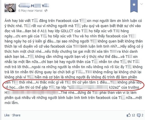 Chi tiết thứ 2 cũng góp phần chống lại khẳng định “Em là giảng viên” của cô gái này là trong một post trên trang cá nhân của mình, cô ghi rất rõ: “Cần thì có thể gặp T. lại lớp “G…K32A2″ của trường…”. Post này được up lên vào ngày 6/5, chỉ trong một thời gian ngắn là 3 tháng, cô sinh viên này có lẽ không thể nào trở thành giảng viên nhanh như vậy.