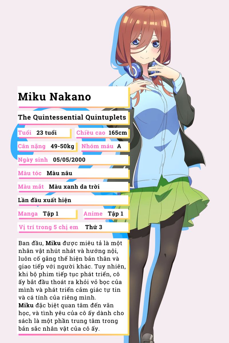 Miku Nakano là cô chị thứ ba trong năm chị em sinh năm của bộ anime nổi tiếng Go-Toubun no Hanayome (The Quintessential Quintuplets). Cô là kiểu nhân vật điển hình của sự dịu dàng, ít nói, sống nội tâm và thường giấu kín cảm xúc của mình.