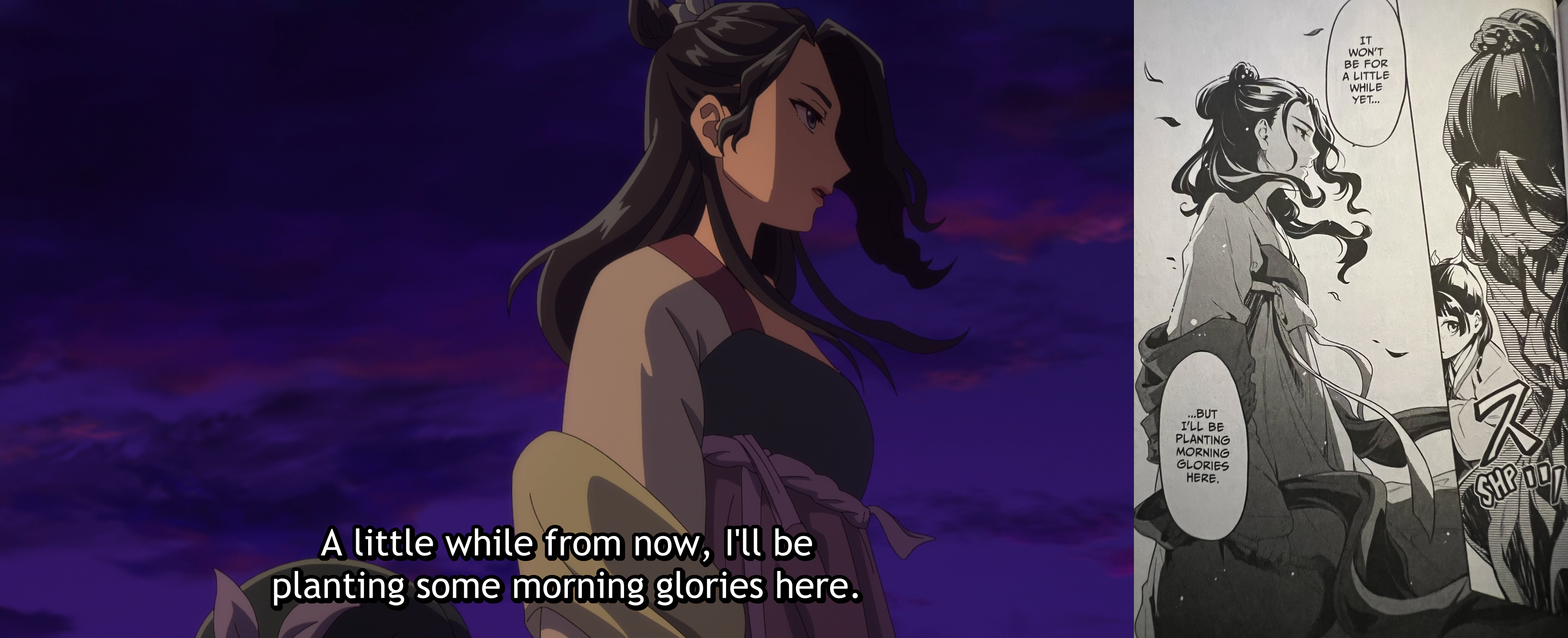 Perhaps the biggest benefit of the anime switching the Suiren and Lakan scenes is the tone the anime is able to convey through this scene. The manga uses shading and dark shadows to convey a sense of foreboding throughout Maomao’s second conversation with Suirei; the anime instead carries over the uneasy tone created from the previous two scenes involving Lakan or mention of him, and builds on it using the dark purple skies in the background and an unsettling piano melody to create that same foreboding feeling the manga was able to convey.