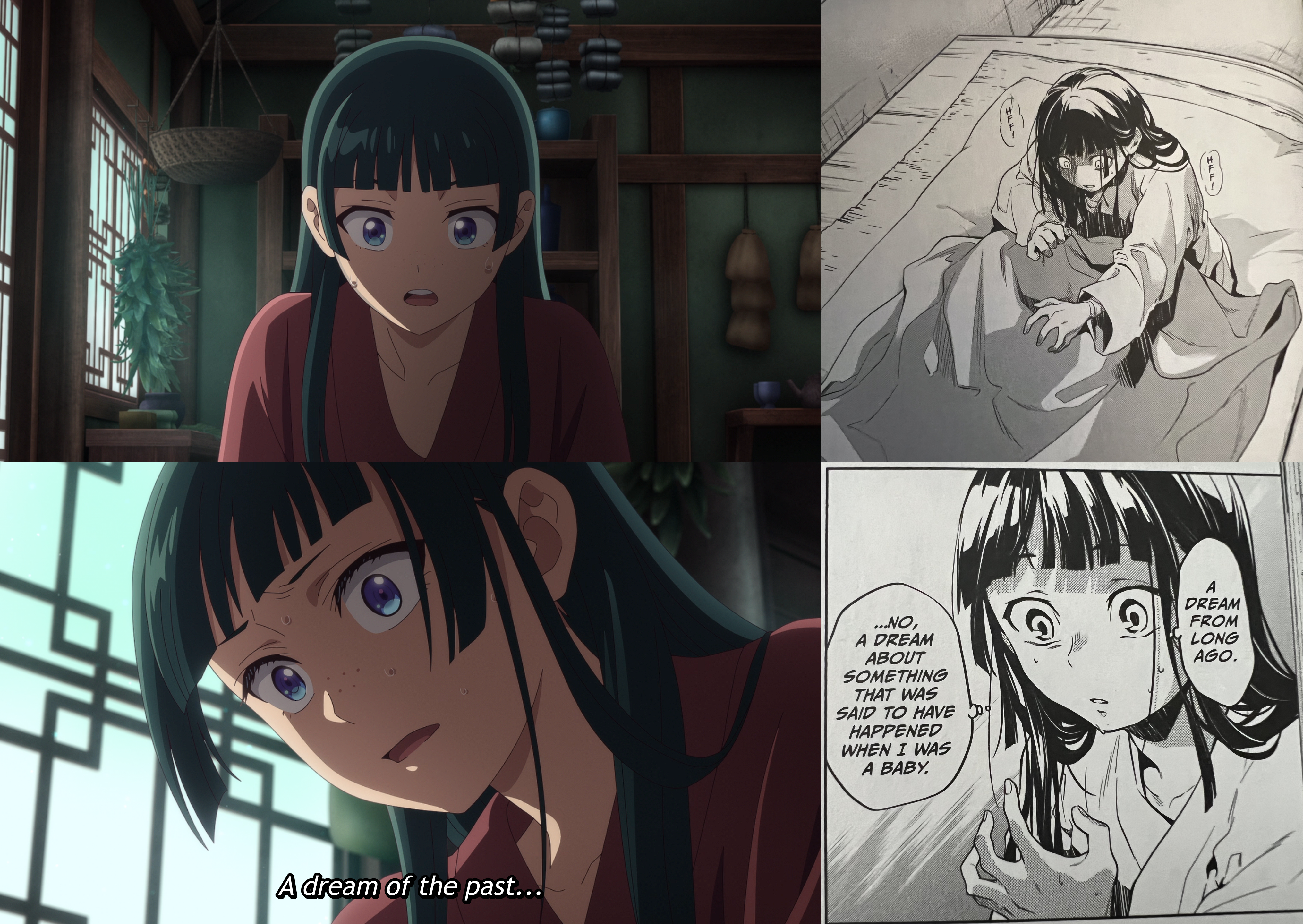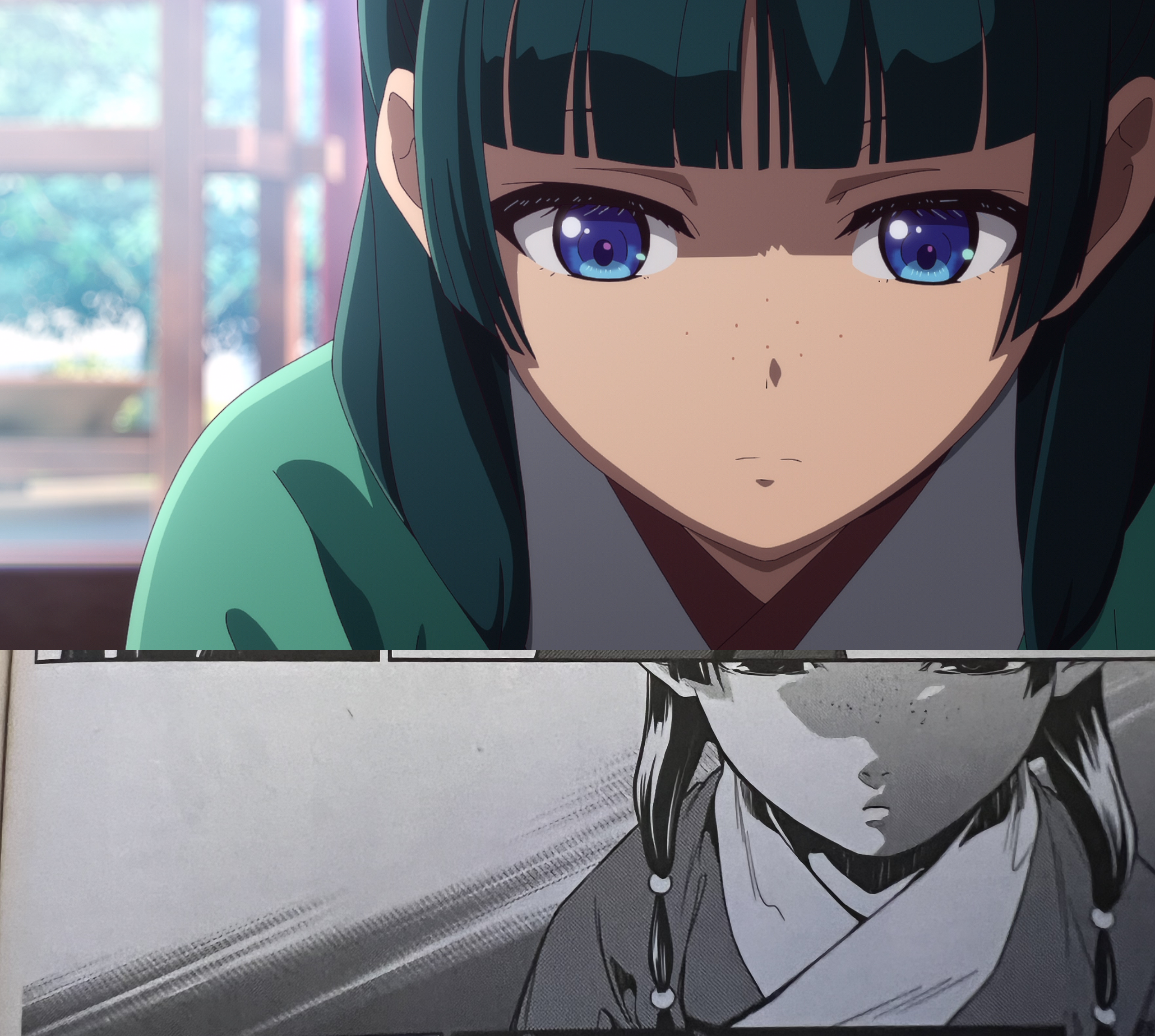 Another example of differences in the anime/manga character designs, and how each medium communicates the same emotions through different expressions. Note how the anime reduces the size of Maomao’s irises and uses details on her brow to show her fright and concern after waking up from her nightmare, whereas the manga instead uses eye shape/style, shading, and unsettled hair to show these same things.