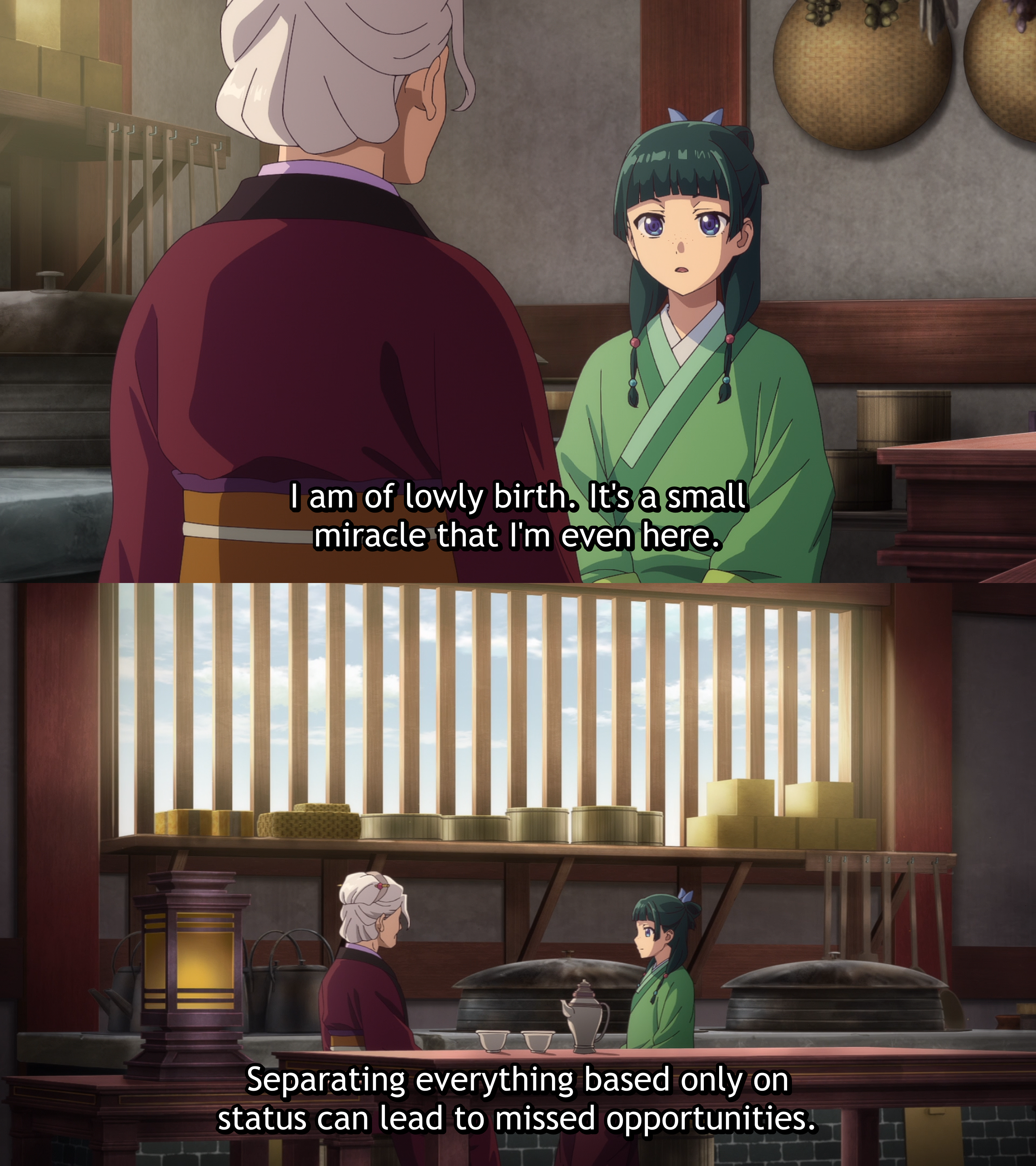 It goes unstated at times, but Apothecary Diaries has quite a bit to say on status divides. Maomao never remains unaware of her place in palace society – frequent remarks on how one small mistake or step out of line could cost her her head, and having to act passive or deferential in situations she could’ve otherwise assisted with much sooner. As a result, Maomao’s low status remains a far greater limitation on her mystery-solving ability than any challenges to her wit or intelligence. Yet as Suiren states, only viewing her options based on status means she’ll miss out on the opportunity to take actions she knows are necessary… and in many cases she’s already risked her head to do so. Even as far back as episode 1, Maomao was doing what she could with her limited resources and status as a servant girl in the inner palace to try and prevent tragedy befalling the children of the emperor. It could be viewed as Maomao having a sense of responsibility as an apothecary, maybe an effect of learning from her adoptive father Luomen – but in that same vein, it could also be an attitude of self-preservation, knowing how bad luck always seemed to follow Luomen as a result of his low status and untimeliness.