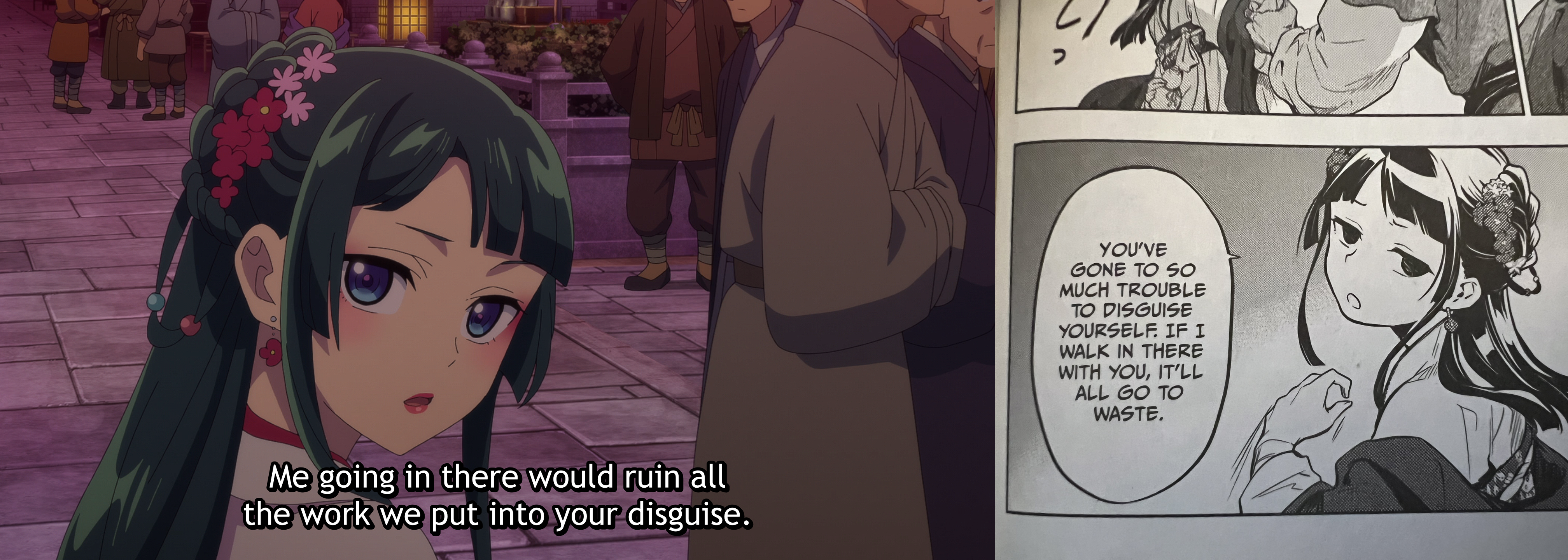 And yet the anime took what is seemingly the complete opposite approach, a lengthly and silent pause on wide shots of Jinshi and Maomao facing one another, interrupted for the briefest of moments by two blink-and-you’ll-miss-it frames of Maomao’s face contorted in hatred. Maomao’s expression is not something the anime holds on like the manga does, but the impact is felt like a sting in the continuing silence afterwards, all the way until the scene mercifully changes to Maomao continuing with her errands.
