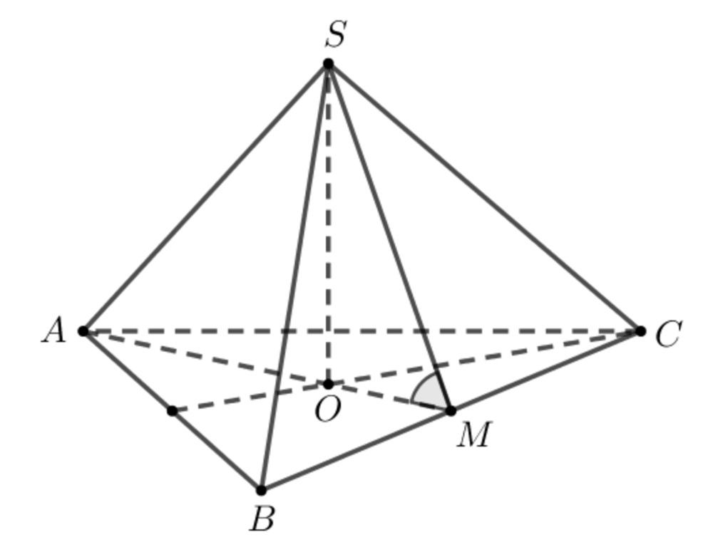 Ta có $SObot left( ABC right);left( left( SBC right),left( ABC right) right)=widehat{SMO}={{60}^{0}}Rightarrow SO=OMtan {{60}^{0}}=dfrac{a}{2sqrt{3}}sqrt{3}=dfrac{a}{2}$