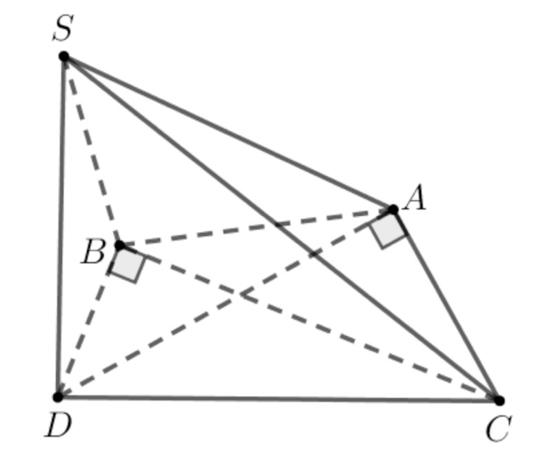 Ta có $ACbot SA,ACbot SDRightarrow ACbot left( SAD right)Rightarrow ACbot AD.$ Tương tự $BCbot SB,BCbot SDRightarrow BCbot left( SBD right)Rightarrow BCbot BD$