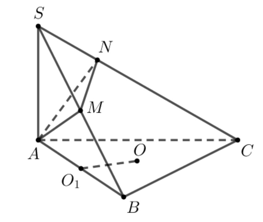 Giảii. Ta có $SM.SB=SN.SC=S{{A}^{2}}Rightarrow BMNC$ nội tiếp nên chóp $A.BMNC$ có mặt cầu ngoại tiếp.