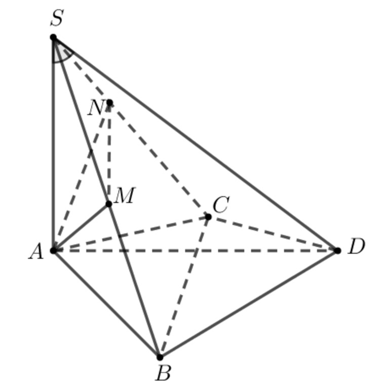 Giải. Ta có $SM.SB=SN.SC=S{{A}^{2}}Rightarrow dfrac{SB}{SC}=dfrac{SN}{SM}Rightarrow Delta SBCbacksim Delta SNM$