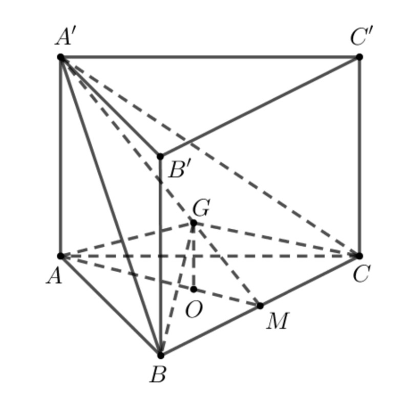 Giải. Gọi $M$ là trung điểm $BC$ và $O$ là trọng tâm tam giác $ABC$ ta có $dfrac{MG}{M{A}’}=dfrac{MO}{MA}=dfrac{1}{3}Rightarrow OG||A{A}’Rightarrow OGbot left( ABC right).$