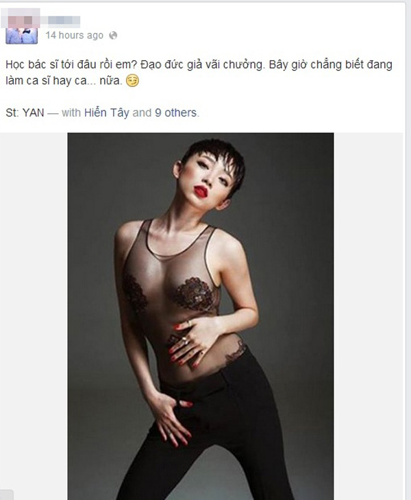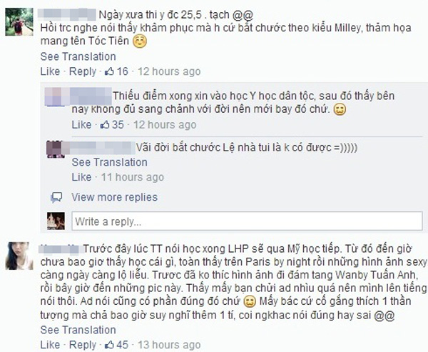 Nhiều bình luận còn ‘ném đá’ mạnh tay hơn, chỉ trích việc nữ ca sĩ chỉ học những điều trong hay ở xứ người. Thậm chí một hot blogger còn lên tiếng chỉ trích Tóc Tiên “đạo đức giả”: “Học bác sĩ tới đâu rồi em? Bây giờ chẳng biết đang làm ca sĩ hay ca… nữa”.