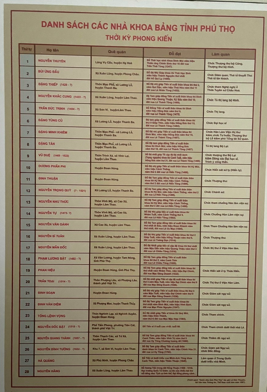 Danh sách các nhà khoa bảng tỉnh Phú Thọ thời kỳ phong kiến trưng bày tại Bảo tàng Hùng Vương