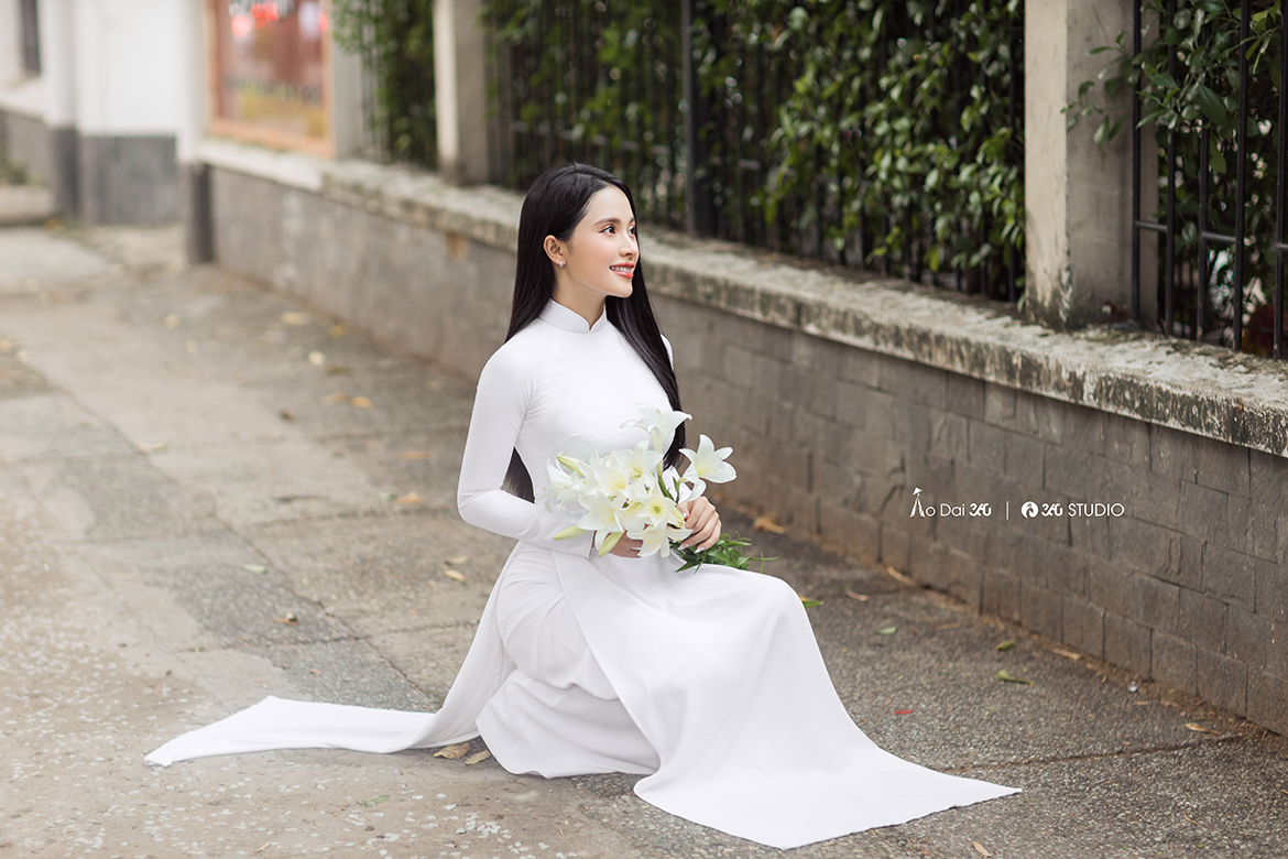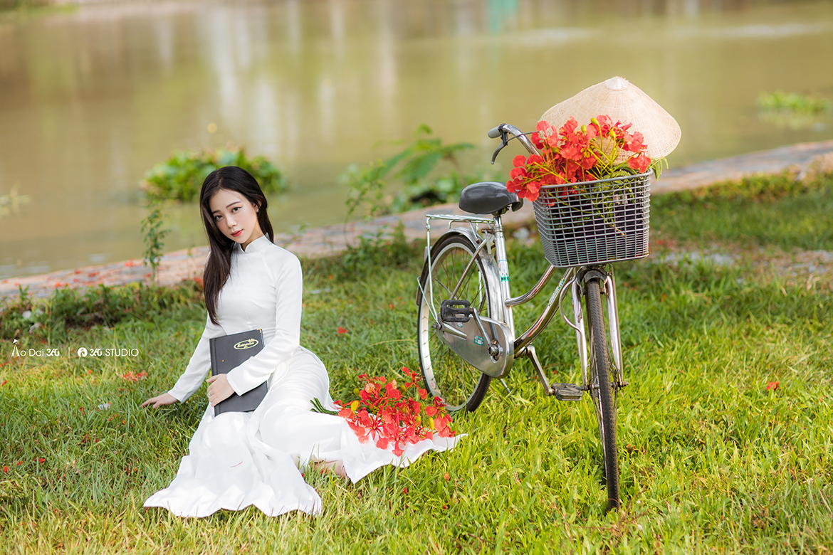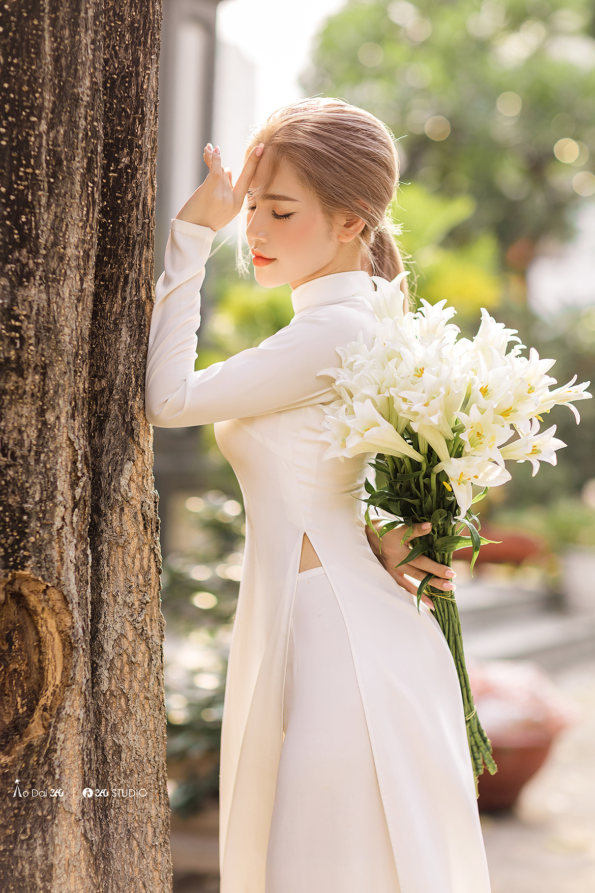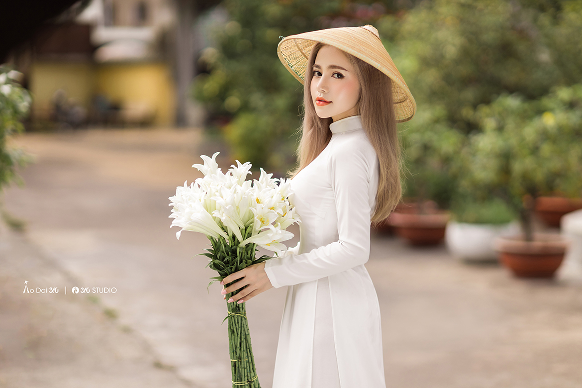 Tạo dáng chụp ảnh áo dài với những đạo cụ đi kèm như: bó hoa sen, hoa cúc họa mi, hoa loa kèn, nón lá, cuốn sổ, cặp sách, đạo cụ âm nhạc,…sẽ khiến các bạn trở nên tự tin và nổi bật hơn nhiều. Khi chụp ảnh áo dài, các bạn nữ thường ưu tiên lựa chọn hoa bởi hoa mang đến vẻ đẹp dịu dàng, duyên dáng cho người chụp.