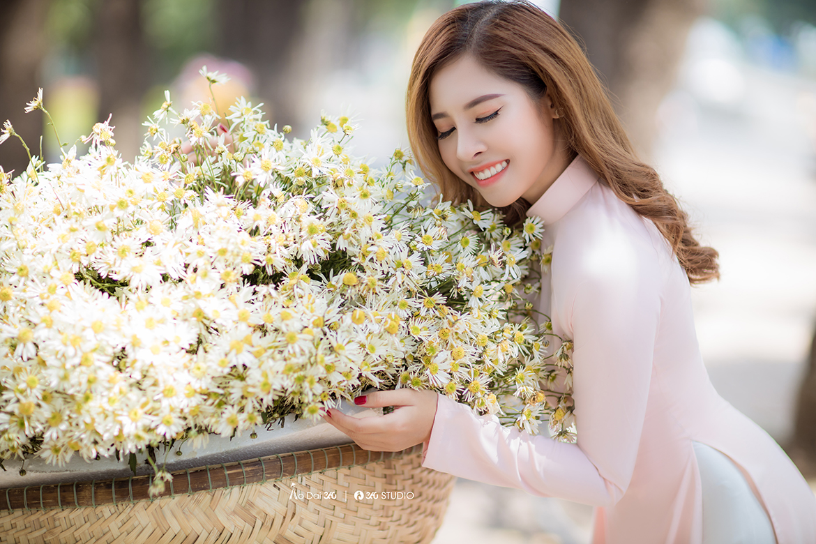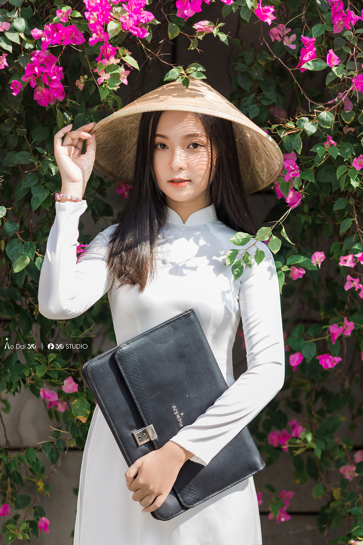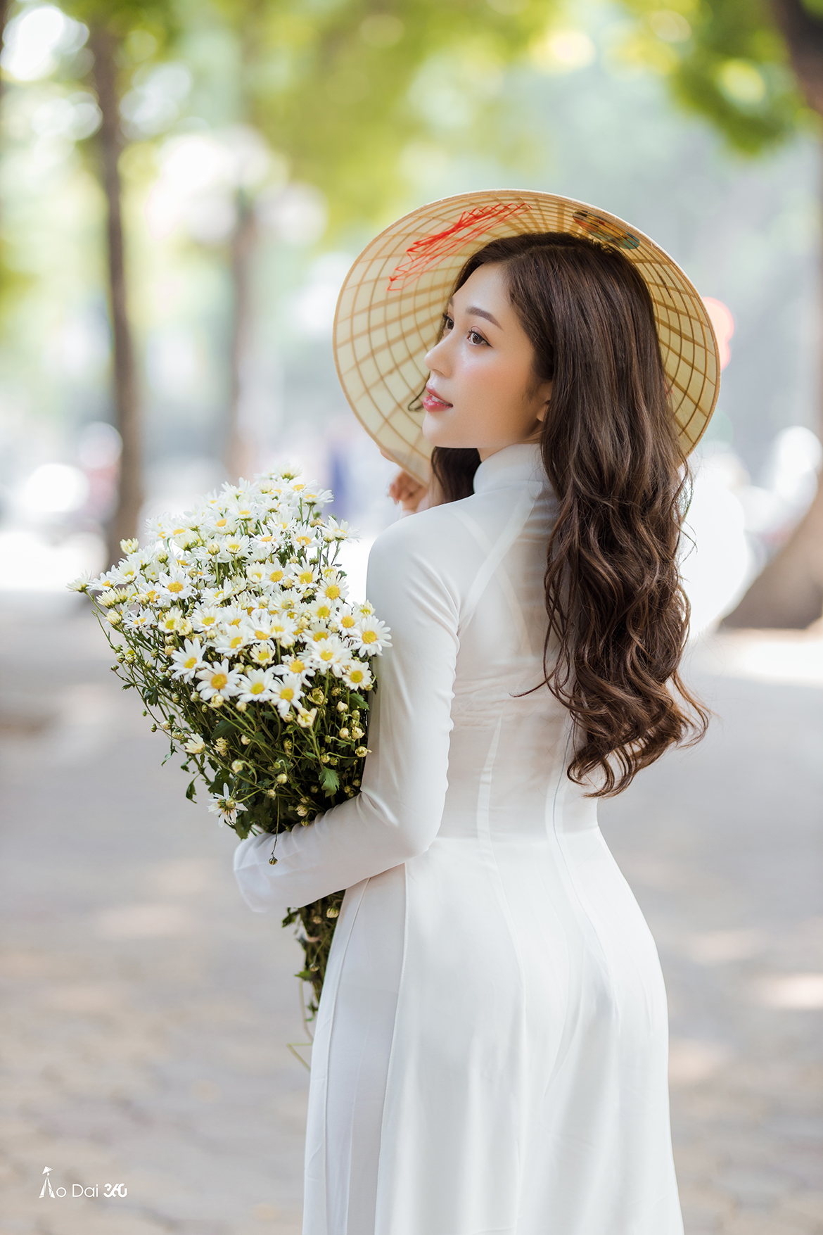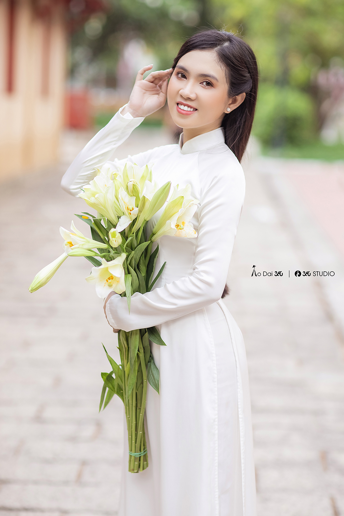 Tạo dáng chụp ảnh áo dài với những đạo cụ đi kèm như: bó hoa sen, hoa cúc họa mi, hoa loa kèn, nón lá, cuốn sổ, cặp sách, đạo cụ âm nhạc,…sẽ khiến các bạn trở nên tự tin và nổi bật hơn nhiều. Khi chụp ảnh áo dài, các bạn nữ thường ưu tiên lựa chọn hoa bởi hoa mang đến vẻ đẹp dịu dàng, duyên dáng cho người chụp.