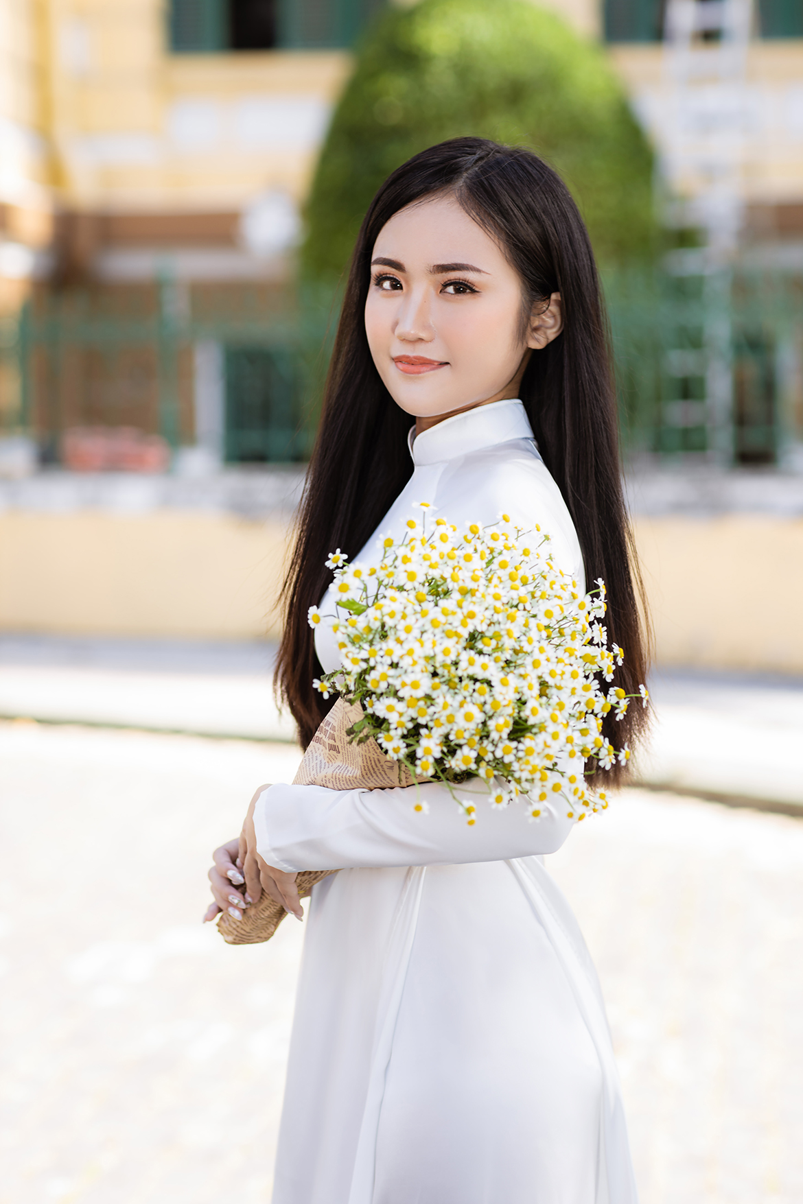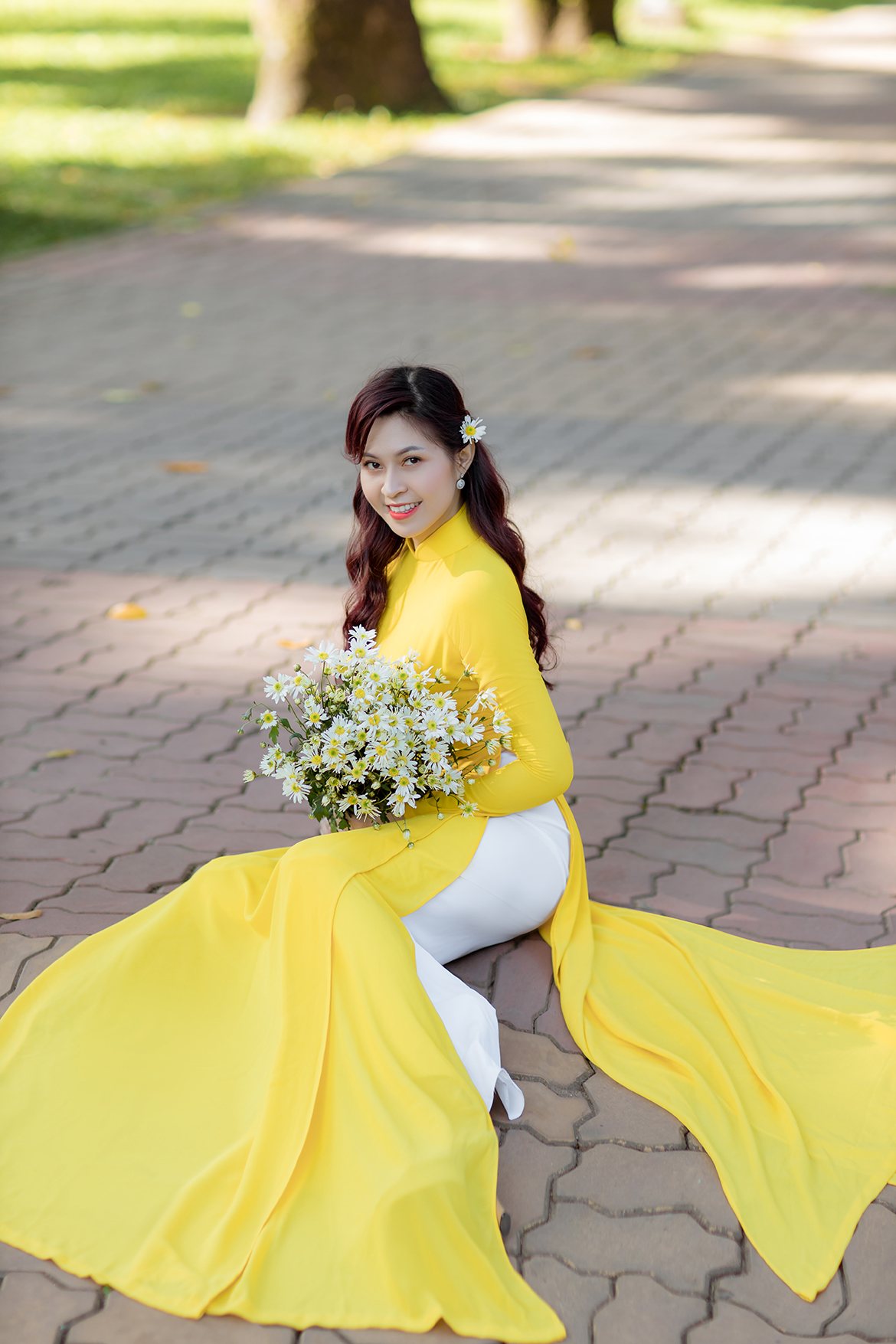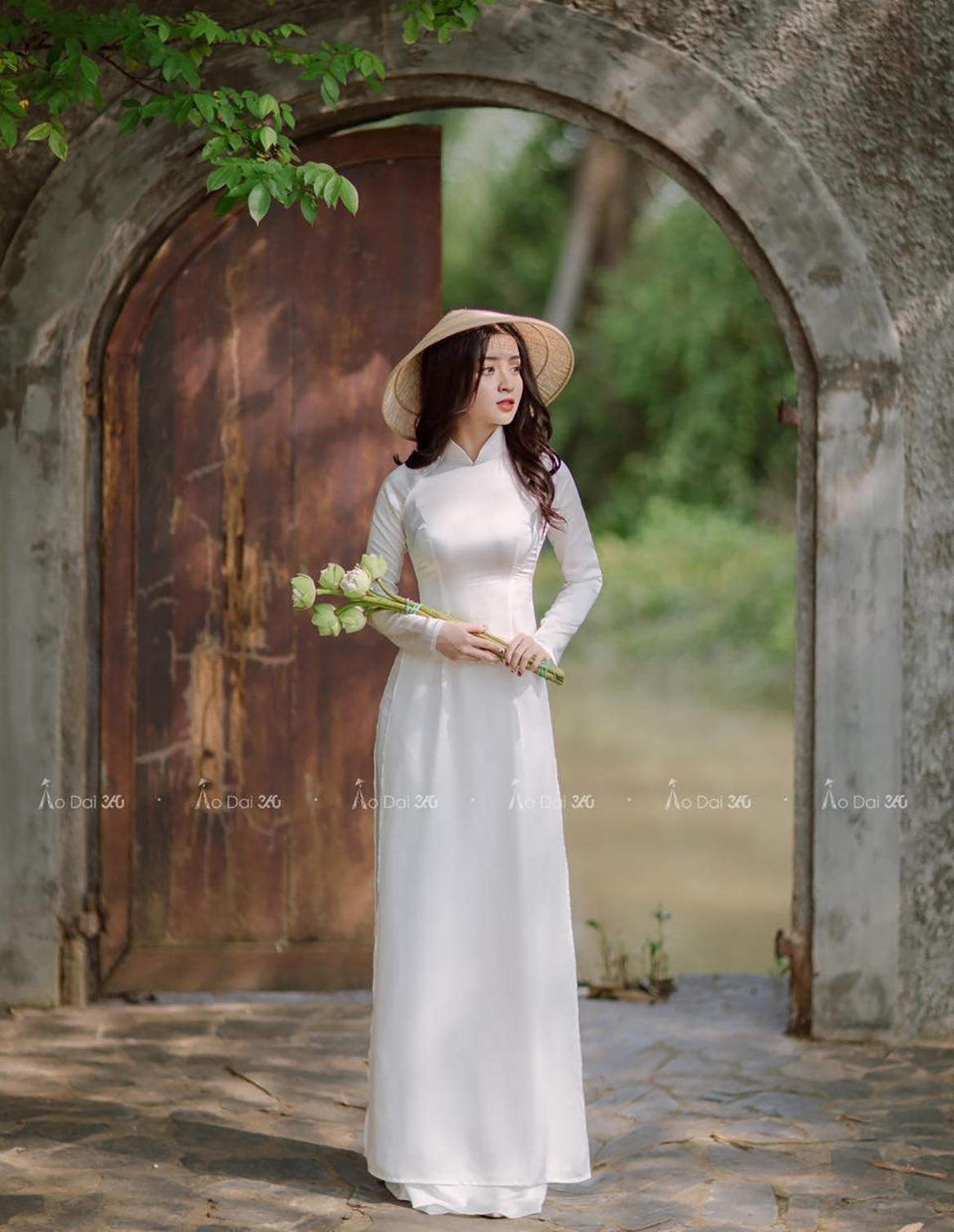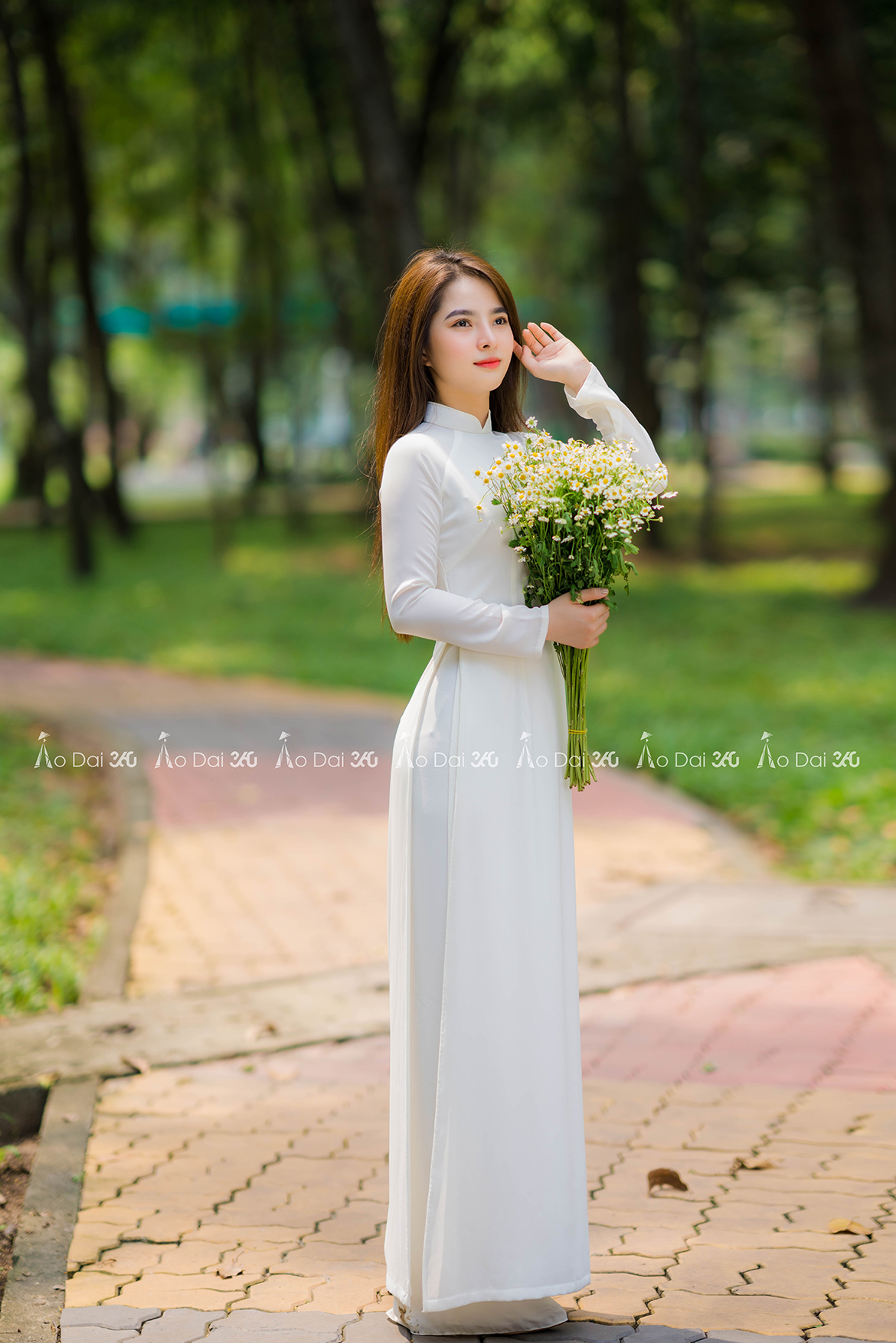 Tạo dáng chụp ảnh áo dài với những đạo cụ đi kèm như: bó hoa sen, hoa cúc họa mi, hoa loa kèn, nón lá, cuốn sổ, cặp sách, đạo cụ âm nhạc,…sẽ khiến các bạn trở nên tự tin và nổi bật hơn nhiều. Khi chụp ảnh áo dài, các bạn nữ thường ưu tiên lựa chọn hoa bởi hoa mang đến vẻ đẹp dịu dàng, duyên dáng cho người chụp.
