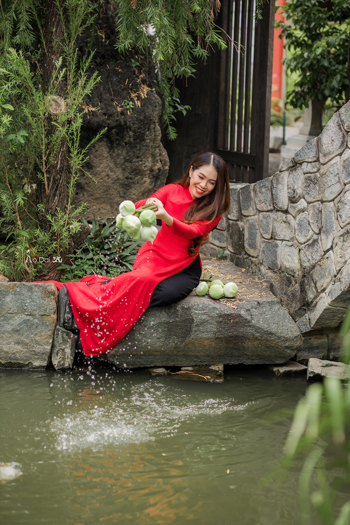 Tạo dáng chụp ảnh áo dài với hoa sen