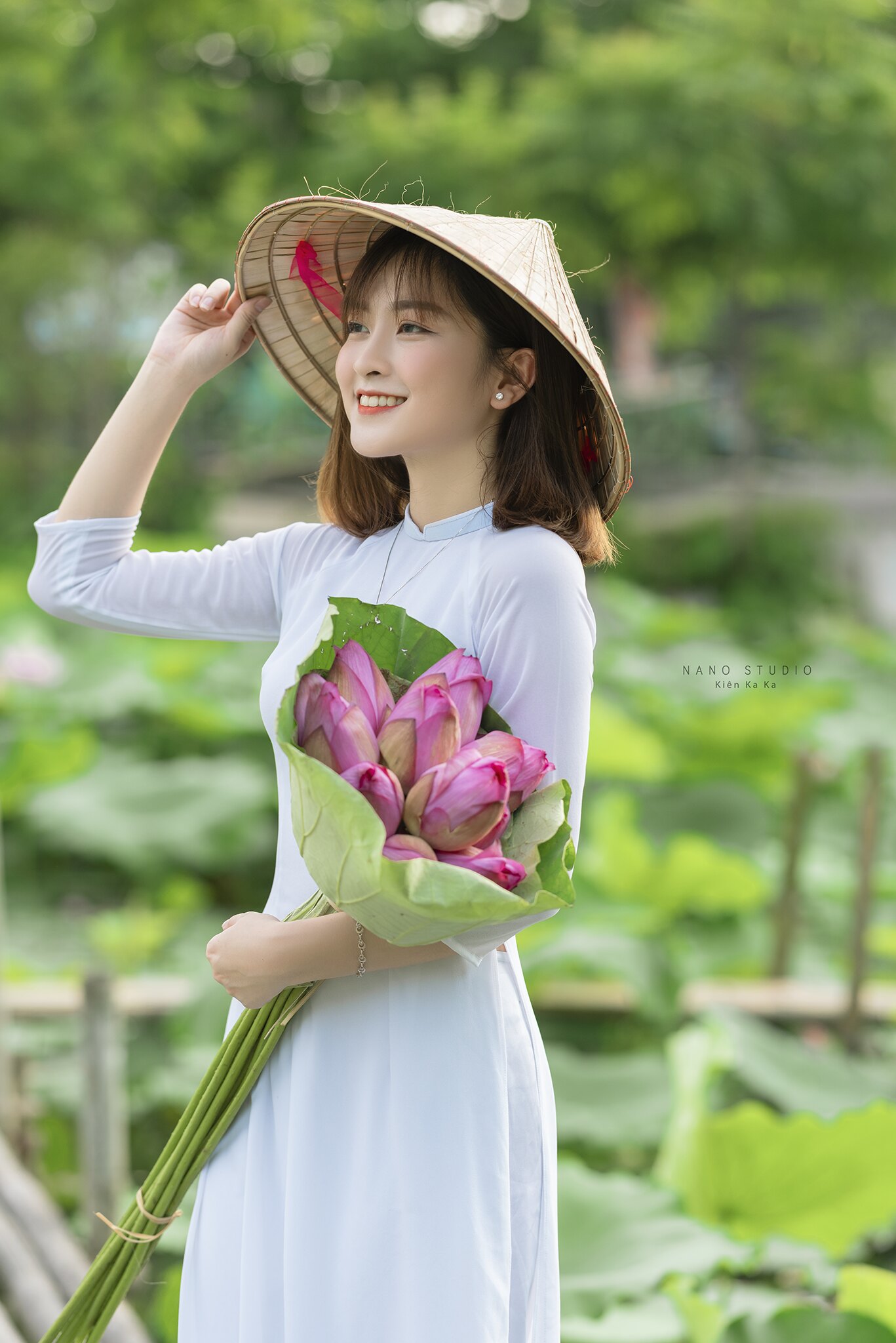 Bạn nên chuẩn bị bó sen nở và búp sen chưa nở để khi chụp có thêm đạo cụ làm phong phú cho bức hình. Các tư thế chụp ảnh với hoa sen như sau: