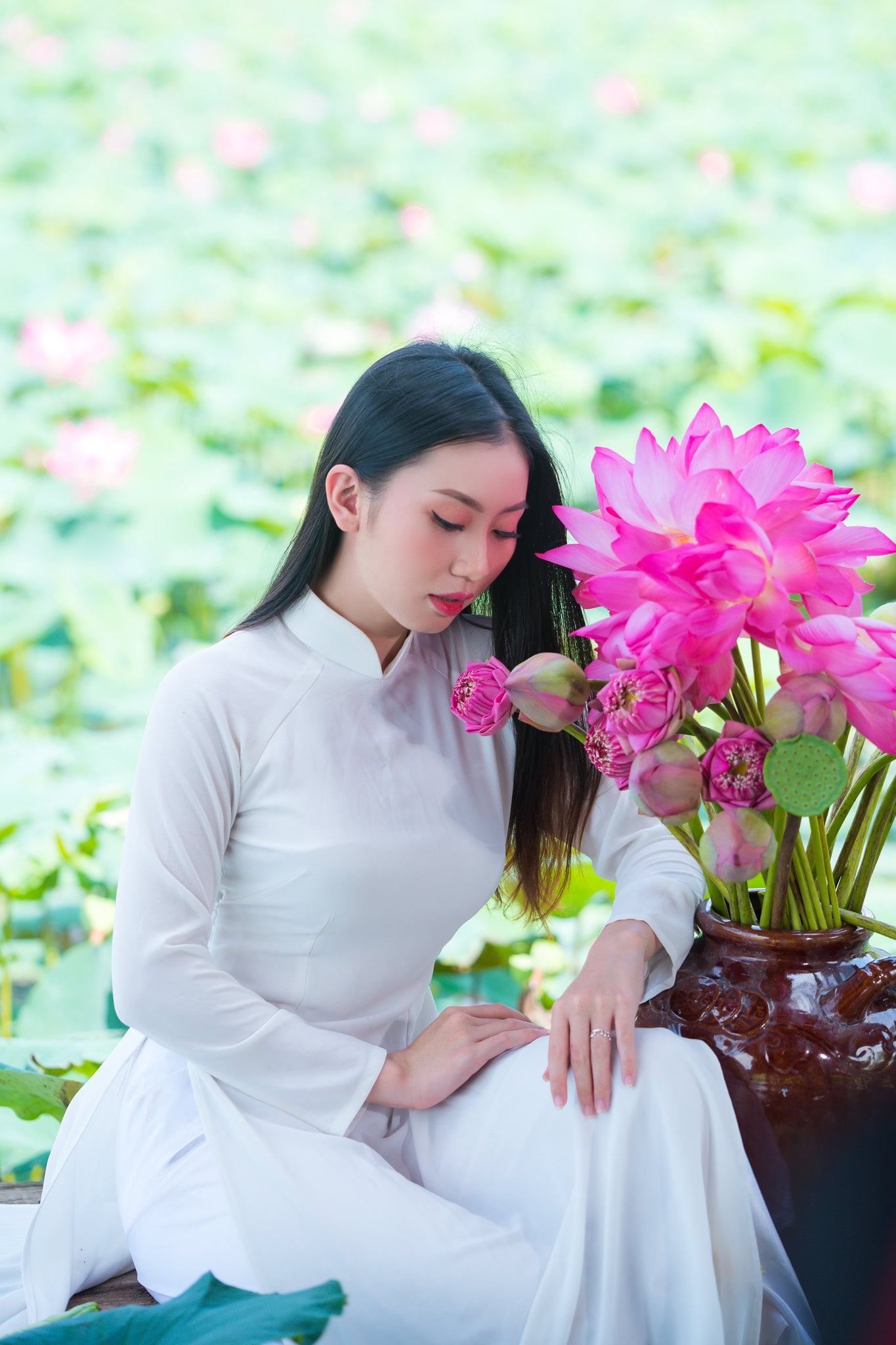 Nếu bạn đang chụp ảnh sen với chiếc áo bà ba truyền thống của người dân nam bộ, thì bên dưới là những góc chụp ấn tượng bạn có thể tham khảo.