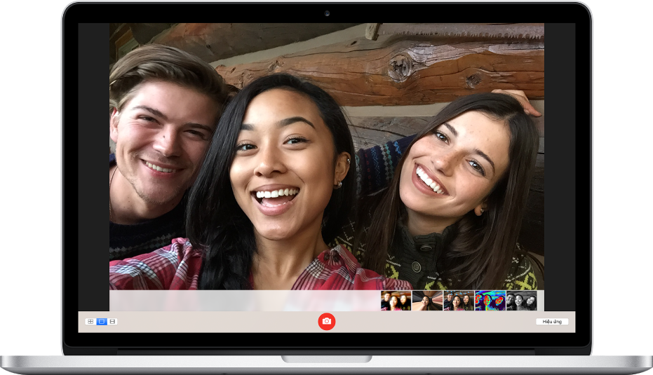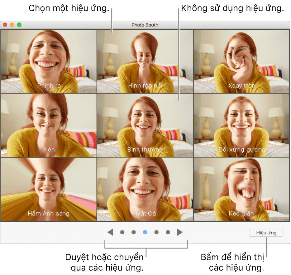 Hiệu ứng và nền ảnh sẽ khiến việc chụp ảnh tự sướng thú vị và tuyệt vời hơn. Để áp hiệu ứng vào khung hình, sau khi chọn chế độ chụp hoặc quay video trên Macbook. Bạn chỉ cần click vào nút Hiệu ứng. Hơn 20 hiệu ứng khác nhau sẽ hiện ra cho bạn lựa chọn. Sau đó, hãy thử các hiệu ứng và nền sau để bắt đầu selfie nhé.