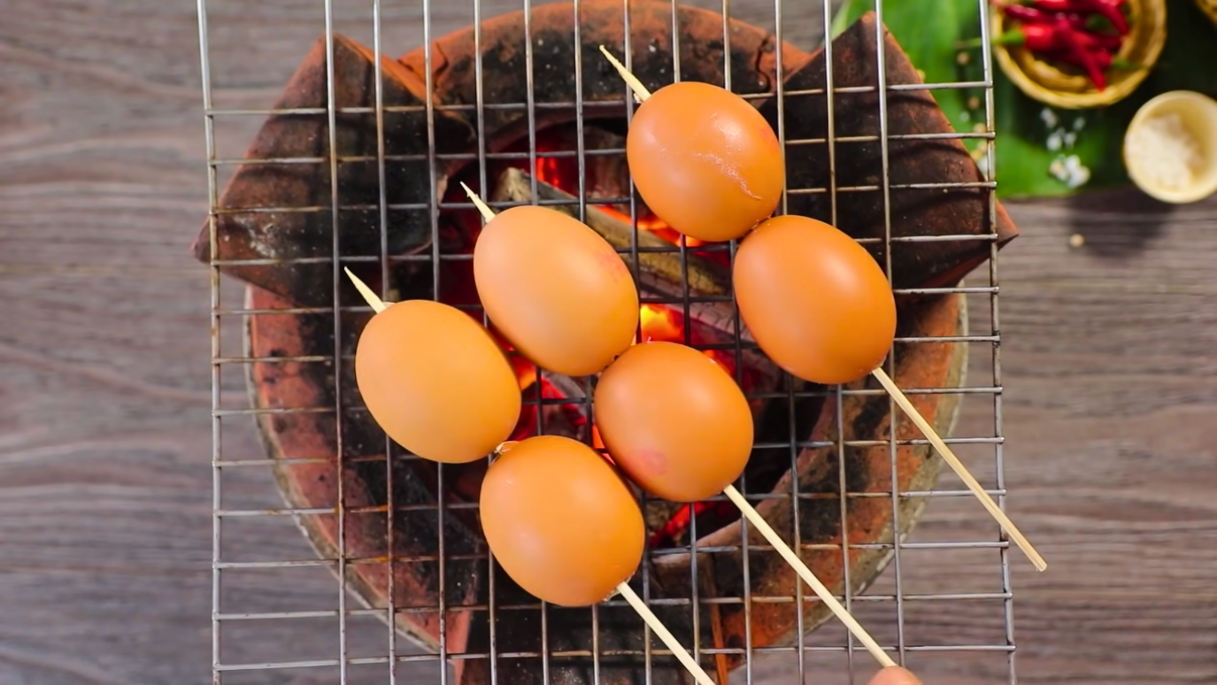 - Chuẩn bị 1 bếp than hồng hoặc bếp điện từ ở 200 độ C. Xếp trứng lần lượt lên vỉ nướng khoảng 5 phút cho vàng đều là được. Ngoài ra, bạn cũng có thể nướng trứng bằng nồi chiên không dầu ở 110 độ C trong khoảng 40 phút.