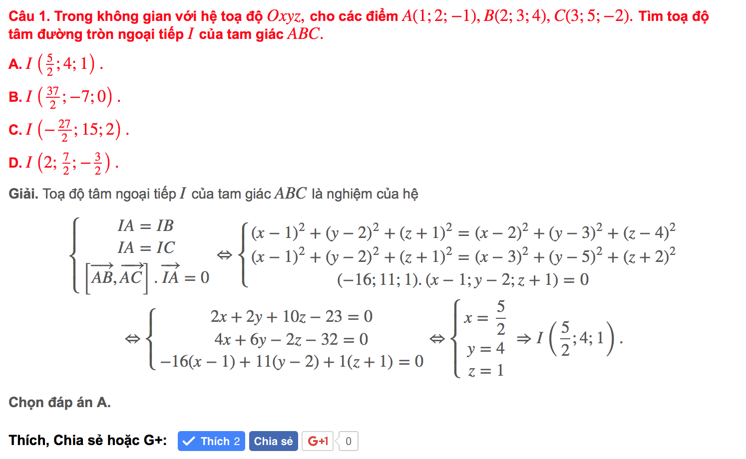 Giải. Toạ độ tâm ngoại tiếp $I$ của tam giác $ABC$ là nghiệm của hệ [begin{gathered} left{ begin{gathered} IA = IB hfill IA = IC hfill left[ {overrightarrow {AB} ,overrightarrow {AC} } right].overrightarrow {IA} = 0 hfill end{gathered} right. Leftrightarrow left{ begin{gathered} {(x – 1)^2} + {(y – 2)^2} + {(z + 1)^2} = {(x – 2)^2} + {(y – 3)^2} + {(z – 4)^2} hfill {(x – 1)^2} + {(y – 2)^2} + {(z + 1)^2} = {(x – 3)^2} + {(y – 5)^2} + {(z + 2)^2} hfill ( – 16;11;1).(x – 1;y – 2;z + 1) = 0 hfill end{gathered} right. hfill Leftrightarrow left{ begin{gathered} 2x + 2y + 10z – 23 = 0 hfill 4x + 6y – 2z – 32 = 0 hfill – 16(x – 1) + 11(y – 2) + 1(z + 1) = 0 hfill end{gathered} right. Leftrightarrow left{ begin{gathered} x = frac{5}{2} hfill y = 4 hfill z = 1 hfill end{gathered} right. Rightarrow Ileft( {frac{5}{2};4;1} right). hfill end{gathered} ]