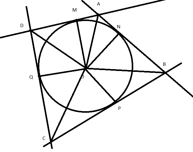 Bài 3: Cho M, N, P, Q là bốn điểm tùy ý trên đường tròn (O). Các tiếp tuyến của (O) tại bốn điểm trên cắt nhau tạo thành tứ giác ABCD. Tính số đo tổng các góc (widehat {AOB} + widehat {COD}).