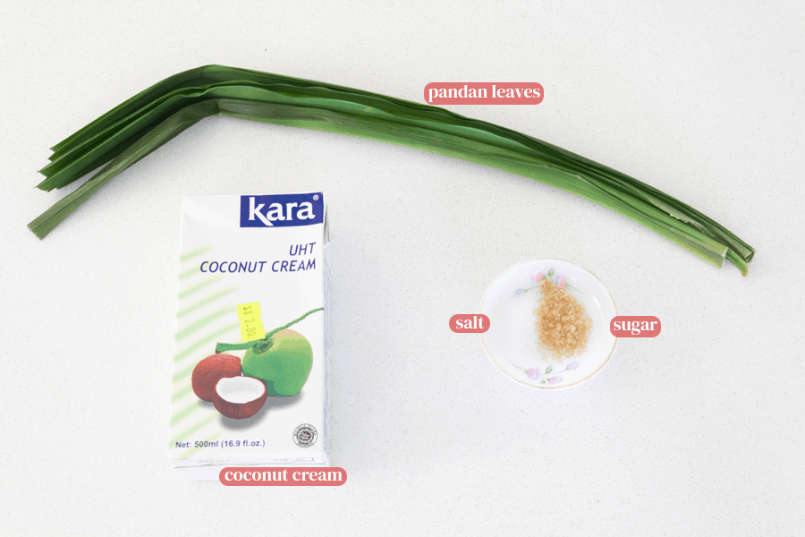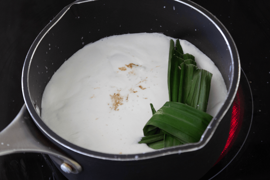 Pour the coconut cream into a small pot and add the pandan leaves, sugar and salt. Bring it to a boil then turn off to cool completely.