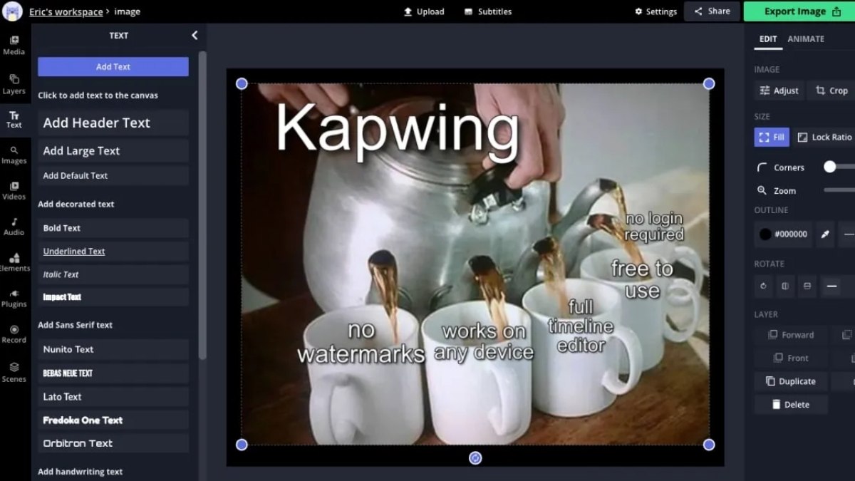 Kapwing là một trong những lựa chọn tốt để tạo và chỉnh sửa meme theo ý muốn của người dùng. Với việc cập nhật hình ảnh hoặc video chỉ trong vài giây, Kapwing giúp bạn hoàn thành việc chế ảnh meme hài một cách nhanh chóng và dễ dàng nhất có thể.