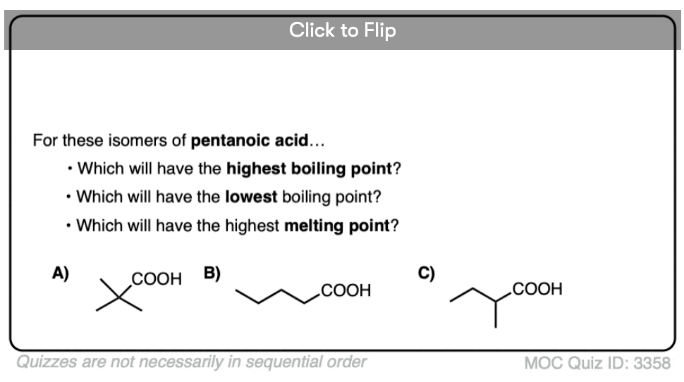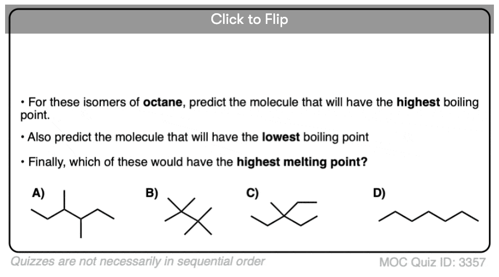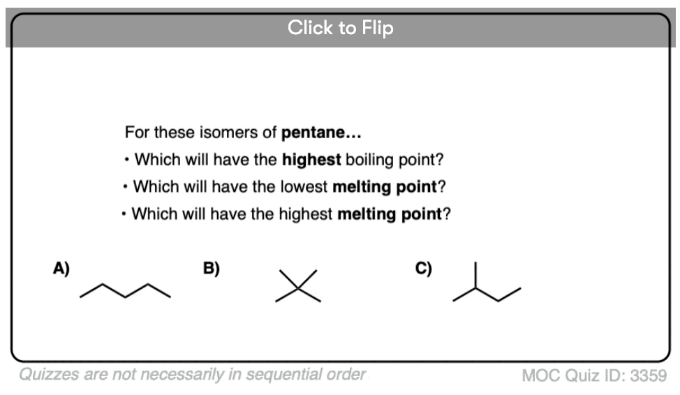 linear versus branched —> higher melting/boiling points due to better stacking and surface area contact.