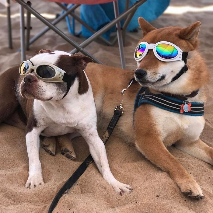 Chú chó đeo kính dạo chơi trên bãi biển, mang đến cảm giác thư thái và vui tươi