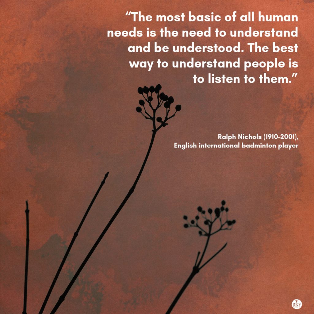 Choosing to Listen to Others and to Myself https://bit.ly/2YhgGqU #perspective #listening Share on X ‘The most basic of all human needs is the need to understand and be understood. The best way to understand people is to listen to them.’ Quote by Ralph Nichols https://bit.ly/2YhgGqU #relationships #listen Share on X