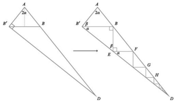Trong bước kế tiếp, họ sẽ dựng tam giác vuông AB’D, bằng cách kéo dài cạnh AB tới điểm D sao cho từ D hạ được đường vuông góc xuống B’A.