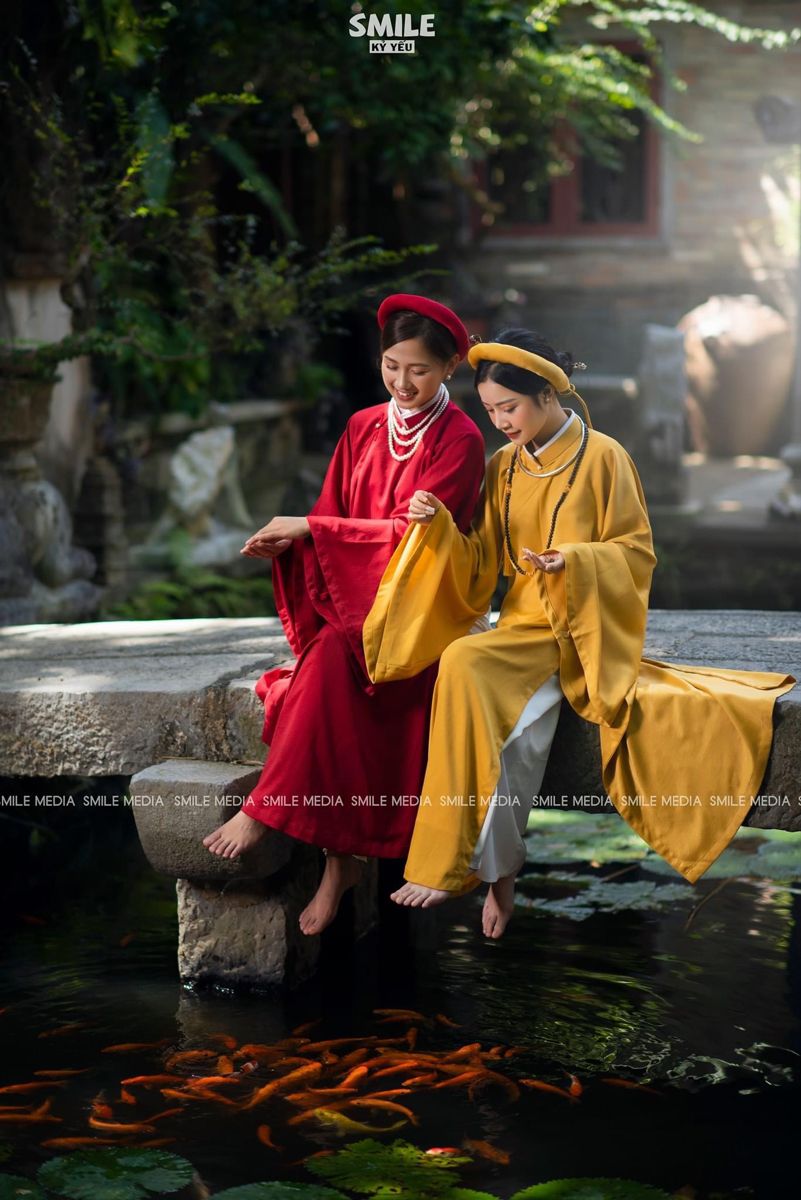 Với 2 người mặc áo dài, bạn có thể lựa chọn các tư thế vừa gần gũi vừa thanh lịch, như đứng đối diện cùng cười, tựa vai nhau hoặc nắm tay bước đi giữa khung cảnh nên thơ. Sự tương tác nhẹ nhàng cùng ánh mắt đồng điệu sẽ mang lại cảm xúc chân thật, giúp bức ảnh không chỉ đẹp mà còn giàu ý nghĩa.