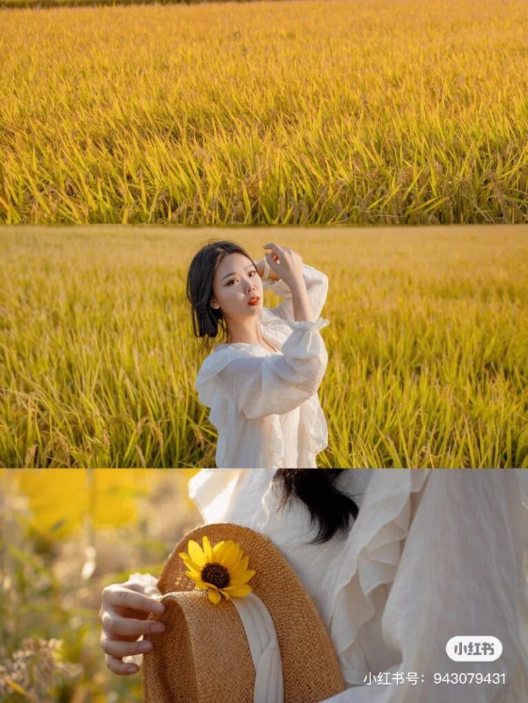 Bạn cũng có thể sử dụng các đạo cụ như hoa, mũ rộng vành hay khăn choàng lãng mạn để tạo nên những sắc thái khác nhau cho bức ảnh. Sự tương phản giữa con người và cánh đồng lúa sẽ tạo nên những hình ảnh độc đáo và thu hút.