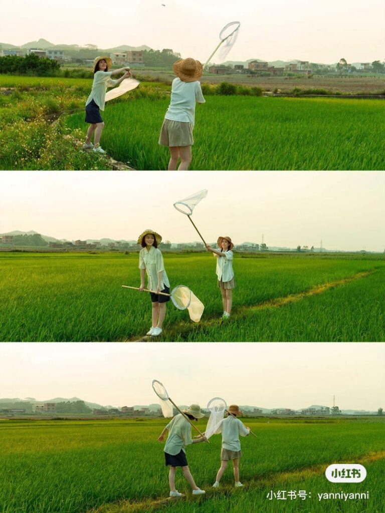 Tạo dáng chụp ảnh kiểu đuổi bắt trên cánh đồng lúa