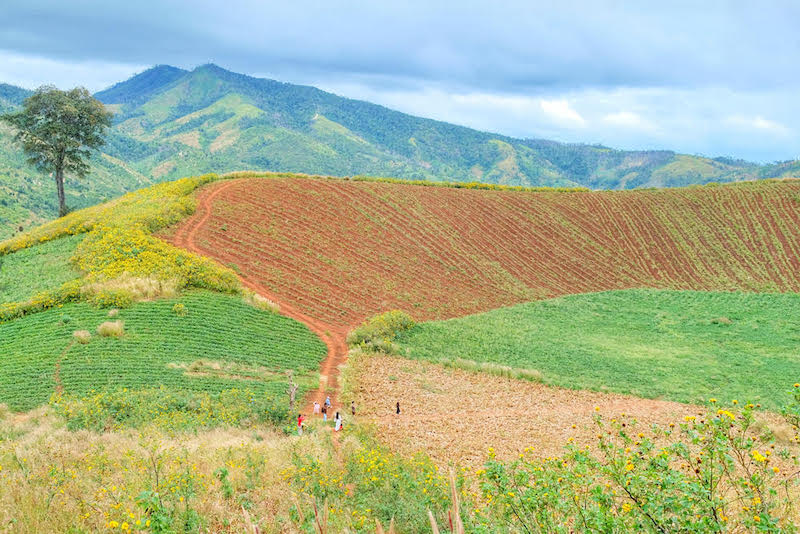Vùng núi đất đỏ bazan cũng là điểm đến thu hút nhiều du khách vào mùa hoa dã quỳ. Hoa dã quỳ thường bắt đầu khoe sắc từ tháng 11 ở Gia Lai. Chử Đăng Ya là ngọn núi lửa được bao phủ bởi sắc xanh của thảm thực vật và sắc vàng rực sáng của hoa dã quỳ. Ai đến Gia Lai cũng ghé đến đây để chụp ảnh cùng ngọn núi lửa có một không hai này. Những bông hoa dã quỳ mọc dọc con đường dẫn đến ngọn núi lửa lên đến đỉnh của núi lửa.
