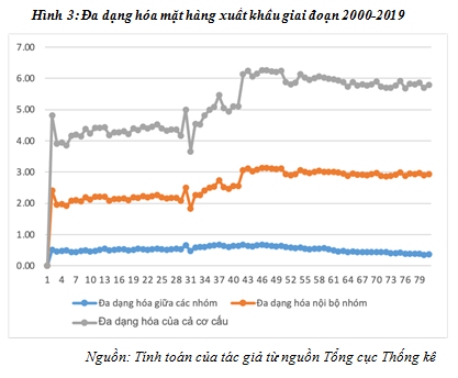 Mức độ đa dạng hóa mặt hàng xuất khẩu cũng cho thấy sự dịch chuyển tích cực. Chỉ số đa dạng hóa nhìn chung có cùng xu hướng biến động với GDP bình quân đầu người cho thấy đa dạng hóa xuất khẩu đã góp phần đáng kể vào việc nâng cao thu nhập và mức sống của người dân. Có được điều này là nhờ cơ chế mở rộng danh mục xuất khẩu của quá trình đa dạng hóa mặt hàng, từ đó nâng cao thu nhập từ xuất khẩu, giúp“giảm sốc” nền kinh tế trước những biến động có tính chu kỳ cũng như những tác động bất ngờ từ thị trường quốc tế, góp phần ổn định vĩ mô, tạo điều kiện cho tăng trưởng kinh tế. Từ năm 2007 trở về trước, cơ cấu hàng hóa xuất khẩu tập trung hơn vào những sản phẩm được coi là truyền thống bao gồm khai thác nhiên liệu thô như dầu mỏ, than đá; sản phẩm khai thác lợi thế điều kiện tự nhiên như thủy sản sơ chế; nông sản như gạo, cao su, cà phê, hạt điều và khai thác lao động giá rẻ như dệt may, giày dép, lắp ráp điện tử.