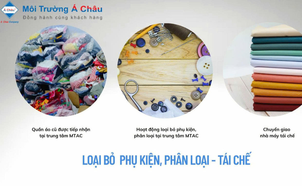 Tái chế – Quần áo cũ đã bị bay màu, nhục, bai vải….khi không còn giá trị sử dụng sẽ được phân loại gỡ các phụ kiện như nút, khuy, khoen, xéc, cúc vải còn lại sẽ được chuyển giao tái chế tại các nhà máy tái chế có chất liệu phù hợp.