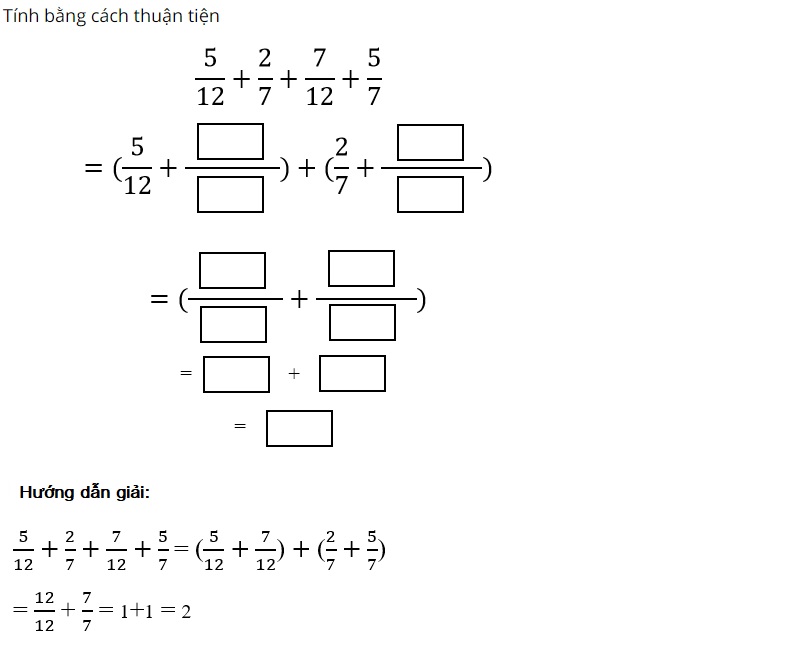 Phương pháp giải: Các em sẽ áp dụng những tính chất của phép cộng các phân số, nhóm chúng thành những phân số có thể tính toán nhanh và chính xác hơn.