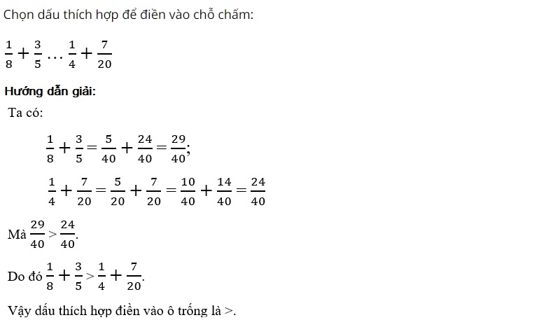 Phương pháp giải: Ta thực hiện tính giá trị của các biểu thức rồi áp dụng quy tắc so sánh phân số tương ứng.