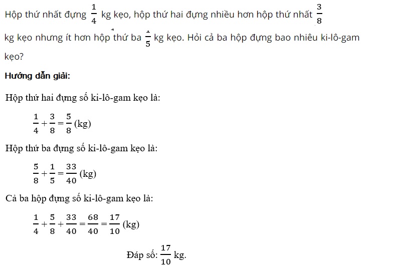 Phương pháp giải: Các em sẽ phải đọc kỹ đề bài đưa ra, để biết được có những dữ kiện nào đã cho, yêu cầu tính gì? Để từ đó áp dụng quy tắc phép cộng các phân số và lời giải chính xác.