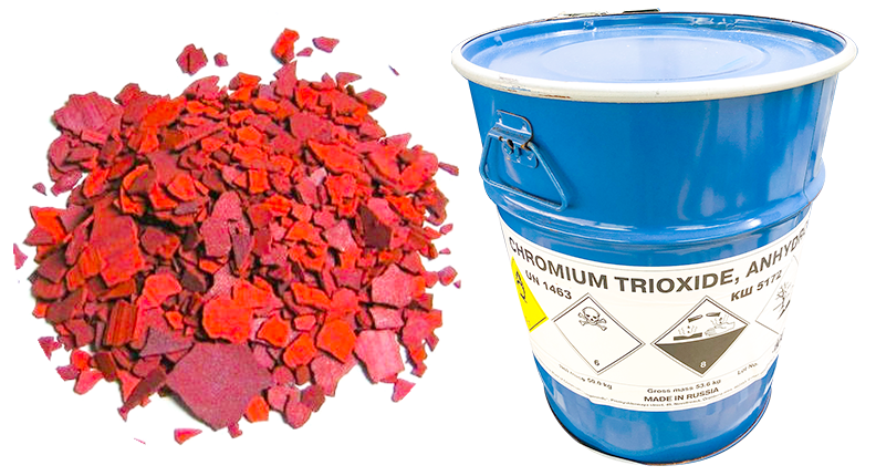 Chromium trioxide hay Crom (VI) oxit là hợp chất vô cơ có công thức hóa học là CrO3, ở điều kiện bình thường chúng là hợp chất ở trạng thái rắn, dạng miếng mỏng hoặc viên có màu đỏ tím, khi bị ướt sẽ chuyển sang màu cam sáng. Chromium trioxide tan tốt trong nước đặc biệt đy là hóa chất có tính oxy hóa rất mạnh. Ứng dụng chủ yếu trong xi mạ, sản xuất hồng ngọc tổng hợp, sản xuất gốm sứ, sơn, luyện kim, xử lý gỗ, dệt nhuộm…