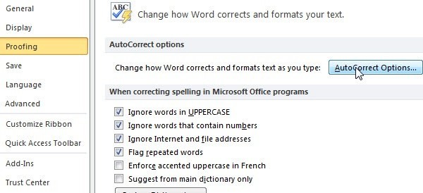Lưu ý: Với phiên bản Word trước 2007, bạn vào Tools rồi chọn AutoCorrect Options.