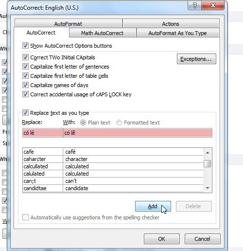 Mỗi từ chúng ta sẽ có một cặp gồm từ đúng, từ sai. Nhập từ sai ở ô bên trái, và từ đúng ở ô bên phải, sau đó bấm Add. Lặp thao tác với các từ tiếp theo.