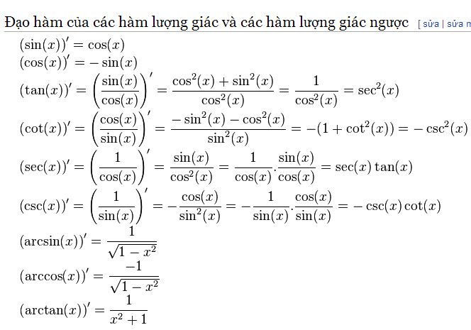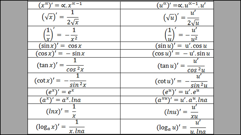 Bảng đạo hàm các hàm số sơ cấp cơ bản