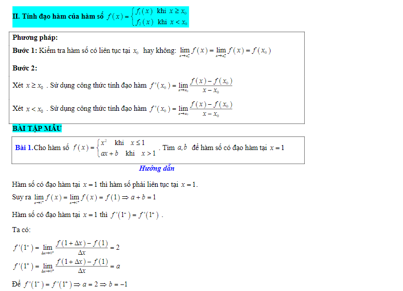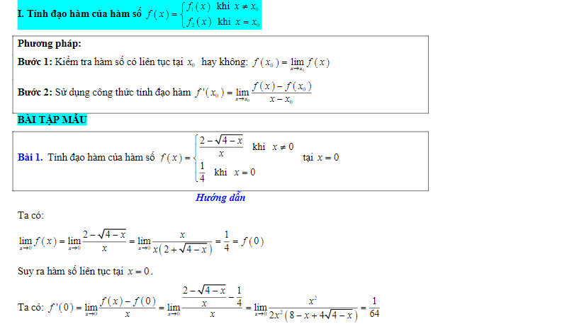 Kiểu 1. Tính đạo hàm của hàm số f(x) bằng f1(x) khi x khác x0 và bằng f2(x) khi x = x0.